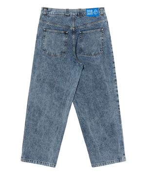 Jeans in heavy washed blue, crafted from 435 gsm cotton denim. Low waist with a dropped crotch and tapered leg in an oversized fit. YKK zip fly with customised button closure. Embroidery on the coin pocket and woven label at the waist. Made in Portugal.